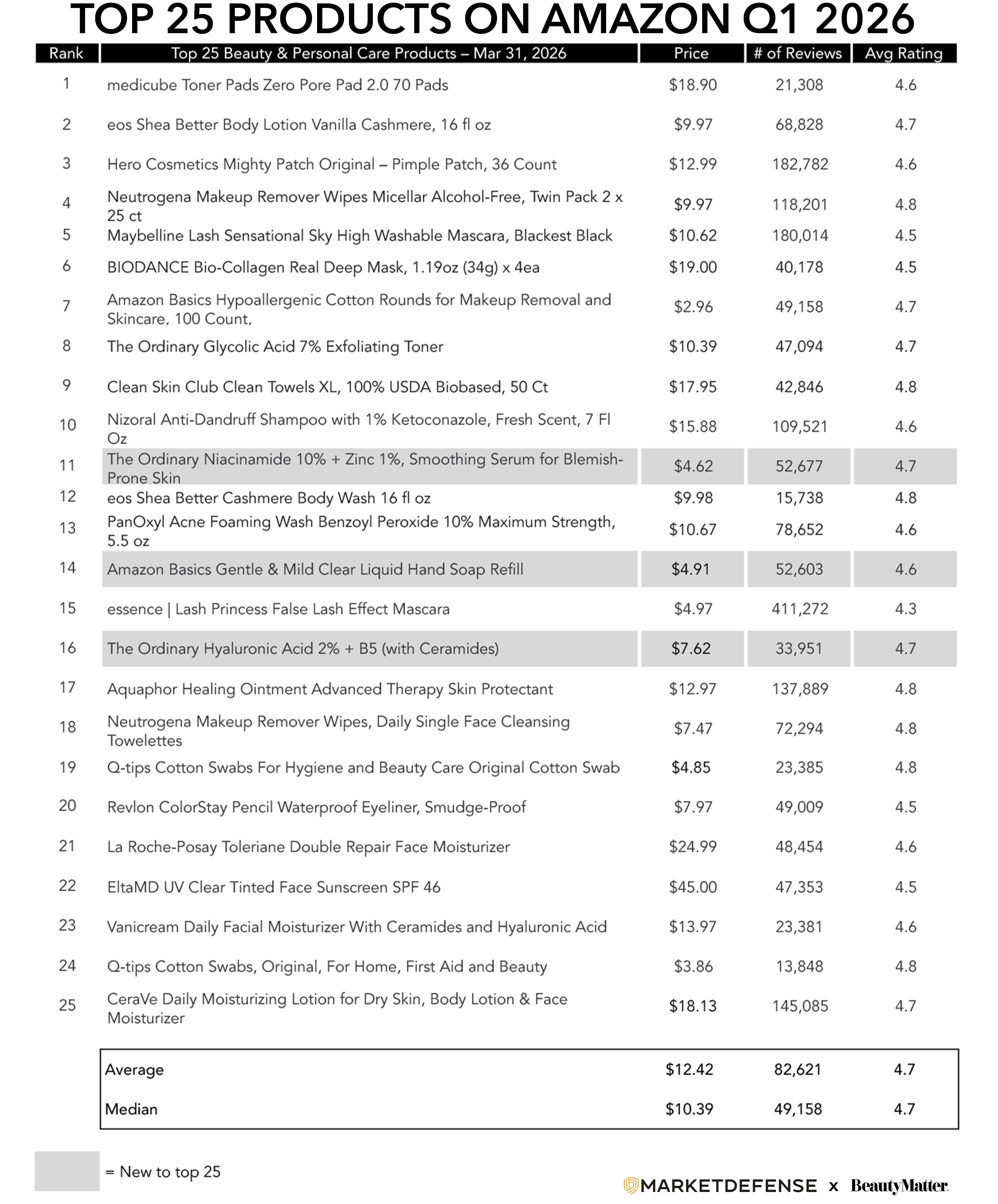 The Top 25 Beauty & Personal Care products for Q1 2026 were led by Medicube Toner Pads Zero Pore Pad 2.0 (#1), marking the first time the product has taken the top position since debuting on the list in Q1 2025. It is followed by Eos Shea Better Vanilla Cashmere Body Lotion (#2) and Hero Cosmetics Mighty Patch (#3), rounding out a trio of high-frequency, routine-driven products.