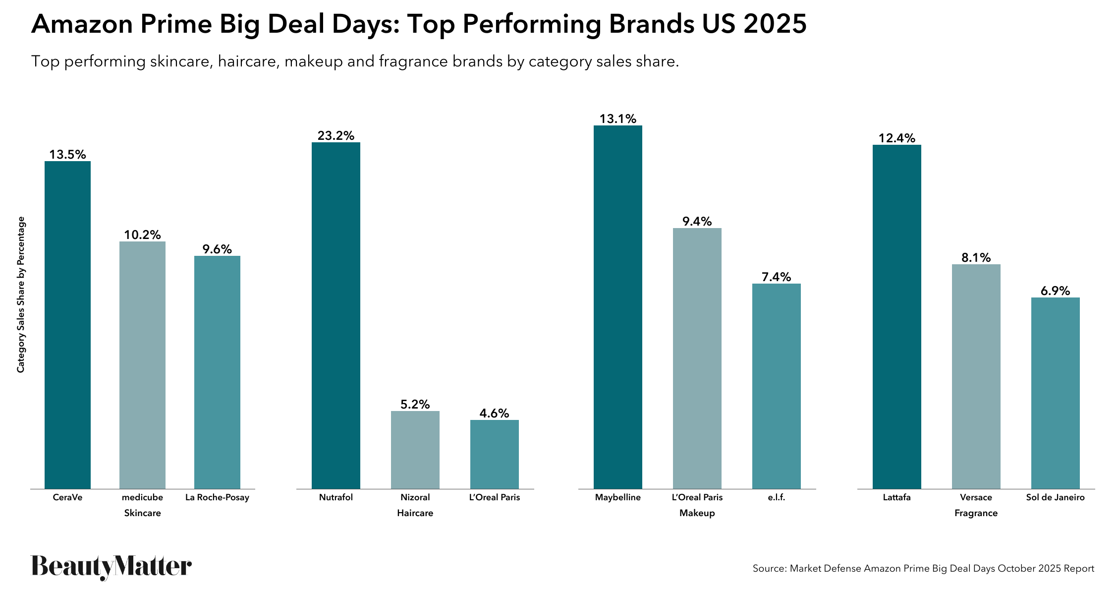 Basket sizes may have been down, and consumers shopped with caution, but a select few beauty brands were the clear winners of Amazon’s Prime Big Deal Days event. According to the Market Defense report, the top three performing skincare brands were CeraVe (13.5% of the category sales share), Medicube (10.2%), and La Roche-Posay (9.6%). The top three performing haircare brands were Nutrafol (23.2%), Nizoral (5.2%), and L'Oréal Paris (4.6%). In makeup, the top three brands were Maybelline (13.1%), L'Oréal Paris (9.4%), and e.l.f. (7.4%). The top-three performing fragrance brands were Lattafa (12.4%), Versace (8.1%), and Sol de Janeiro (6.9%).