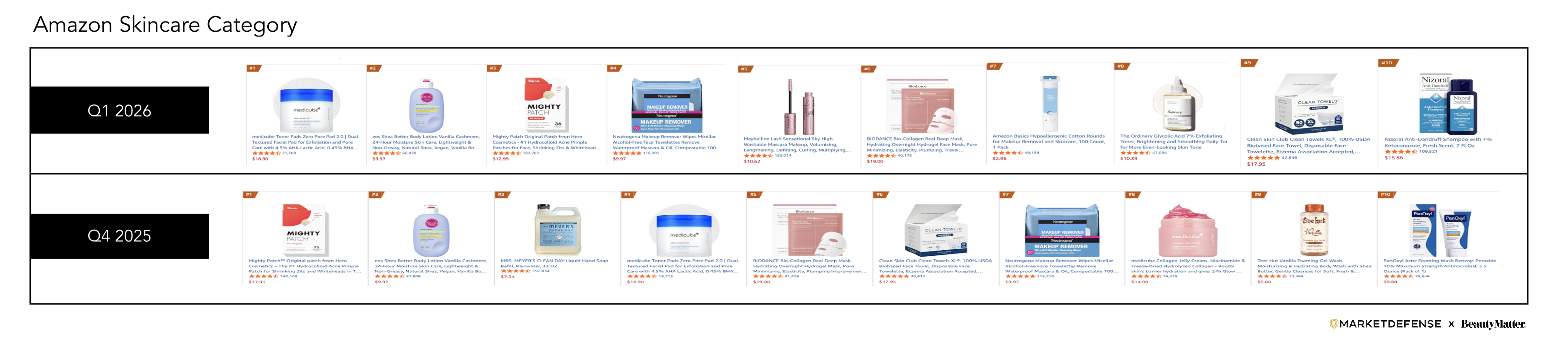 Capping off Q1, Amazon’s Big Spring Sale ran March 25 to 31, and the Top 10 selling beauty products during the event looked very different from the quarter’s overall Top 25. The event was led by new launches from K-beauty brands, with Medicube once again at the top. The brand placed five products in the Top 10 selling beauty products of the Big Spring Sale across pads, masks, creams, serums, and cleansers, with Zero Pore Pads 2.0 taking the #1 position and the Collagen Night Wrapping Mask following at #2.