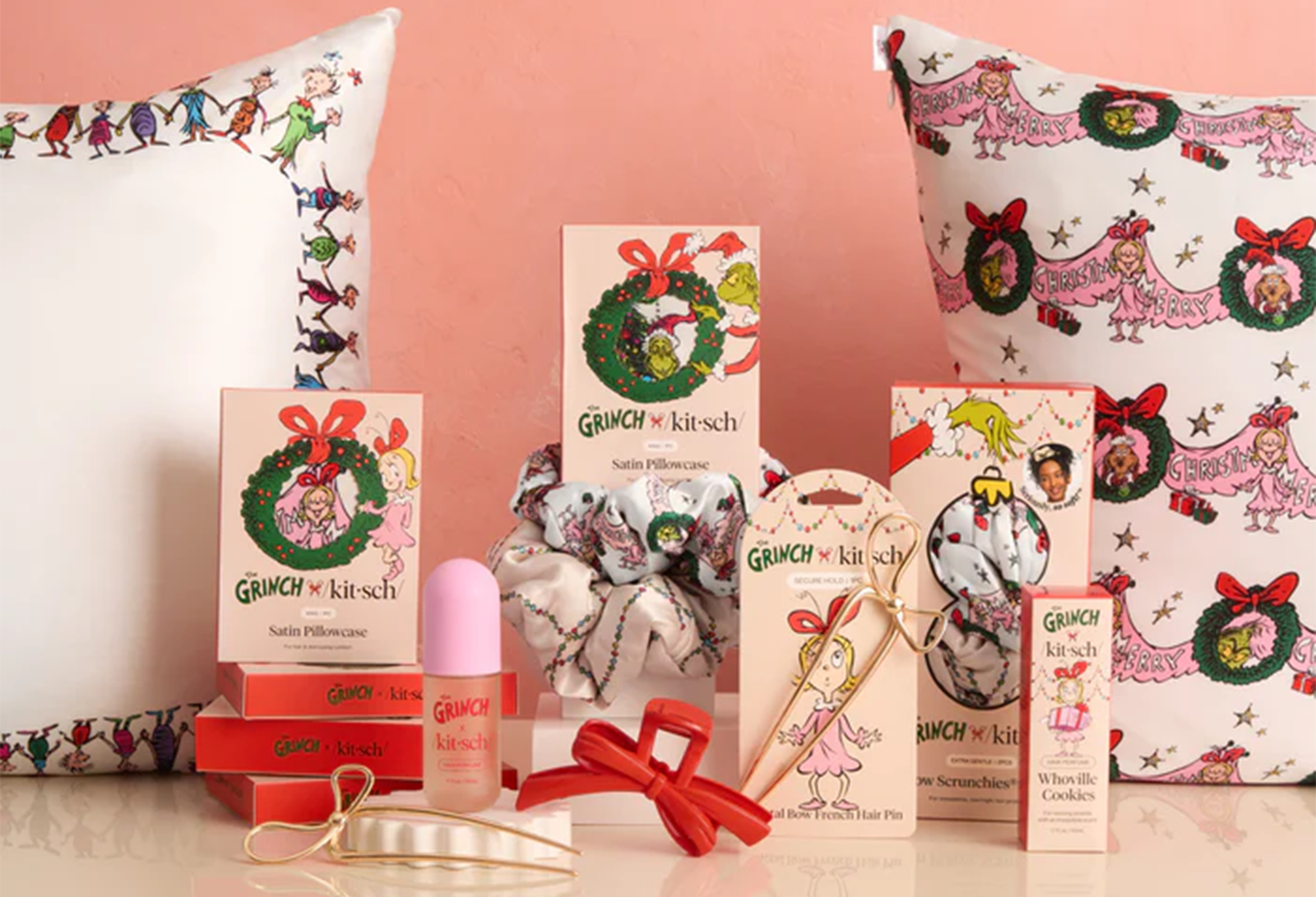 The Grinch x Kitsch: The global beauty brand has teamed up with The Grinch for a limited-edition collection of hair accessories. The line features Pillow Satin Scrunchie 2 Piece Set, Metal Bow French Hair Pin, Bow Claw Clip, and Standard Satin Pillowcase, featuring characters from the movie. The Whoville Cookies Hair Perfume blends the scent of buttercream caramel, vanilla, and tonka bean. Products range from $10 to $22.