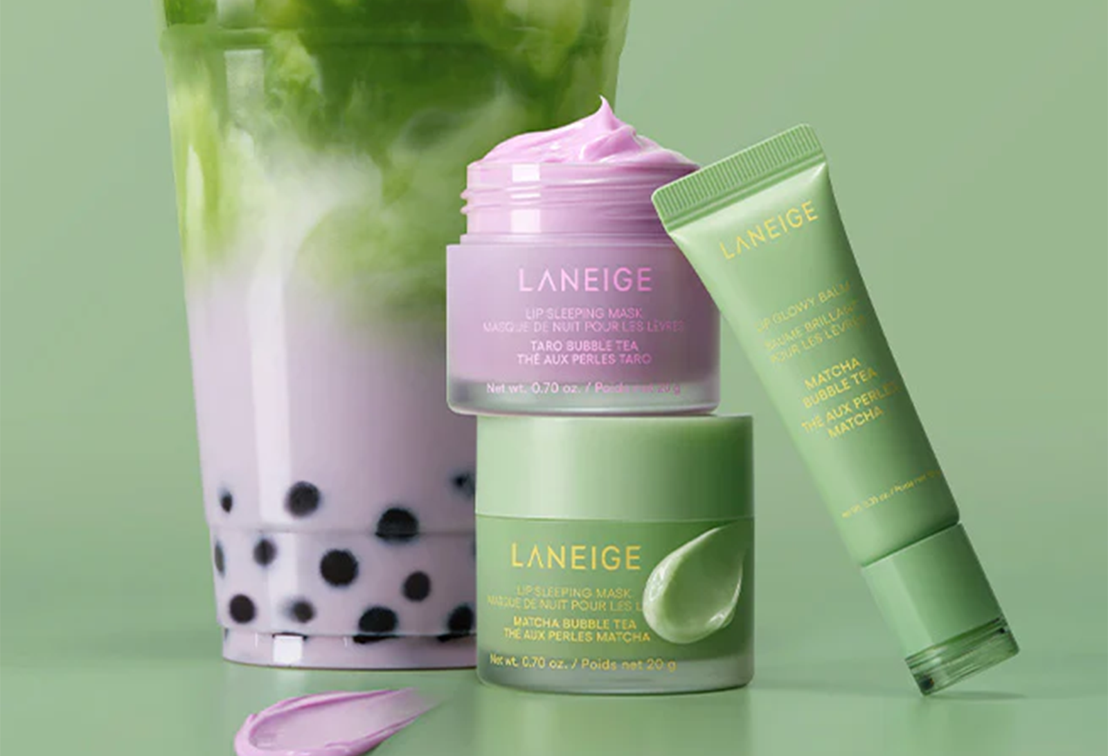 Laneige: Lip Sleeping Mask in Matcha Bubble Tea and Taro Bubble Tea ($24) delivers intense hydration and nourishment, formulated with shea butter, coconut oil, murumuru butter, and vitamin C. Lip Glowy Balm in Matcha Bubble Tea and Taro Bubble Tea ($19) combines nourishing properties of a lip balm with the shiny finish of a lip gloss to deeply hydrate and soften the lips. Both products are infused with the soothing aroma of matcha or taro.