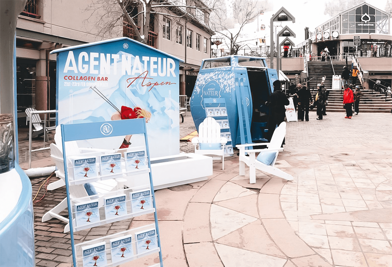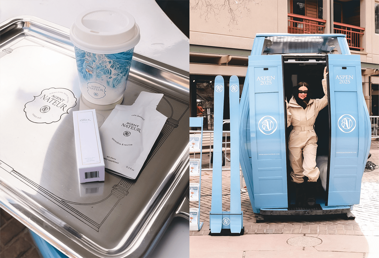 Agent Nateur: The luxury wellness beauty brand presented a ski-themed Collagen Bar at Gondola Plaza at Aspen Mountain in Colorado. Attendees were invited to experience the brand's signature offerings in a curated, cozy lounge area featuring a freestanding, branded gondola and skis, set against a serene mountain backdrop. The activation celebrated the recent launch of Agent Nateur’s Après Ski Winter Recovery Kit, a collection designed to help skin recover from harsh winter conditions. A free hot-drink kiosk was on hand, offering Agent Nateur's best-selling Holi (Mane) Marine Collagen crafted into wellness beverages, including the Holi (Mane) Latte, Jena’s Famous Matcha, and Salty Hot Chocolate. The pop-up saw the continuation of the rising print trend across experiential events, with an editorial-inspired Agent Nateur newspaper segment featuring information on the brand's products, decorated with cartoon images of characters taking to the slopes.