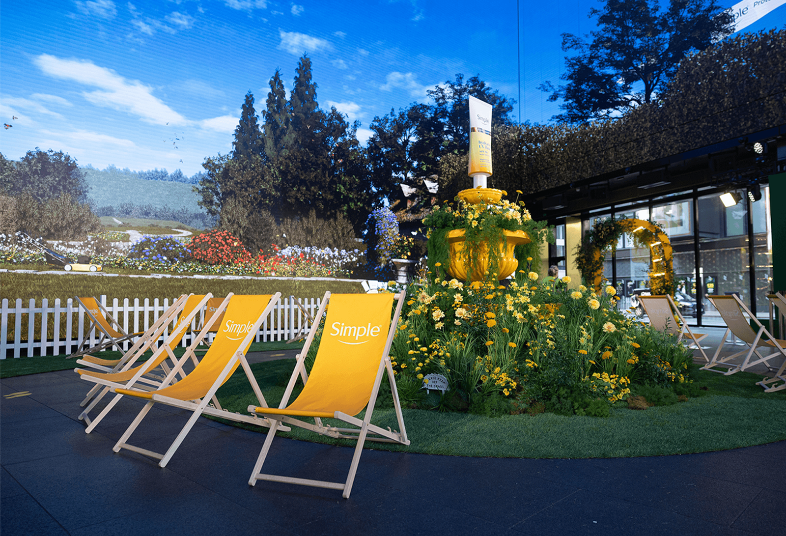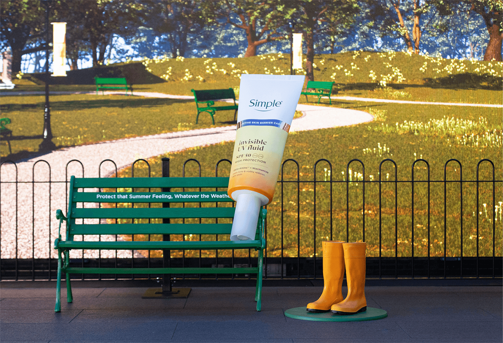 Simple: Taking place at Outernet London, Simple’s Whatever the Weather Experience was a multisensory pop-up where interactive games and storytelling pushed the brand's mission to “Protect That Summer Feeling, Whatever the Weather.” The pop-up focused on the launch of UV Fluid SPF 50, another play on “Whatever the Weather,” teaching consumers the importance of year-round SPF application while highlighting the product's natural antioxidant defenses. Designed as an unpredictable Great British Summer, the space featured large screens that spanned across the walls and ceilings, transitioning from bright sunny days to strong showers, featured as a backdrop to photo moments, including a swing where visitors could sit next to an oversized SPF and capture content. Interactive games, such as a stand-inside wind machine, encouraged consumers to educate themselves on the product while catching samples to take home.