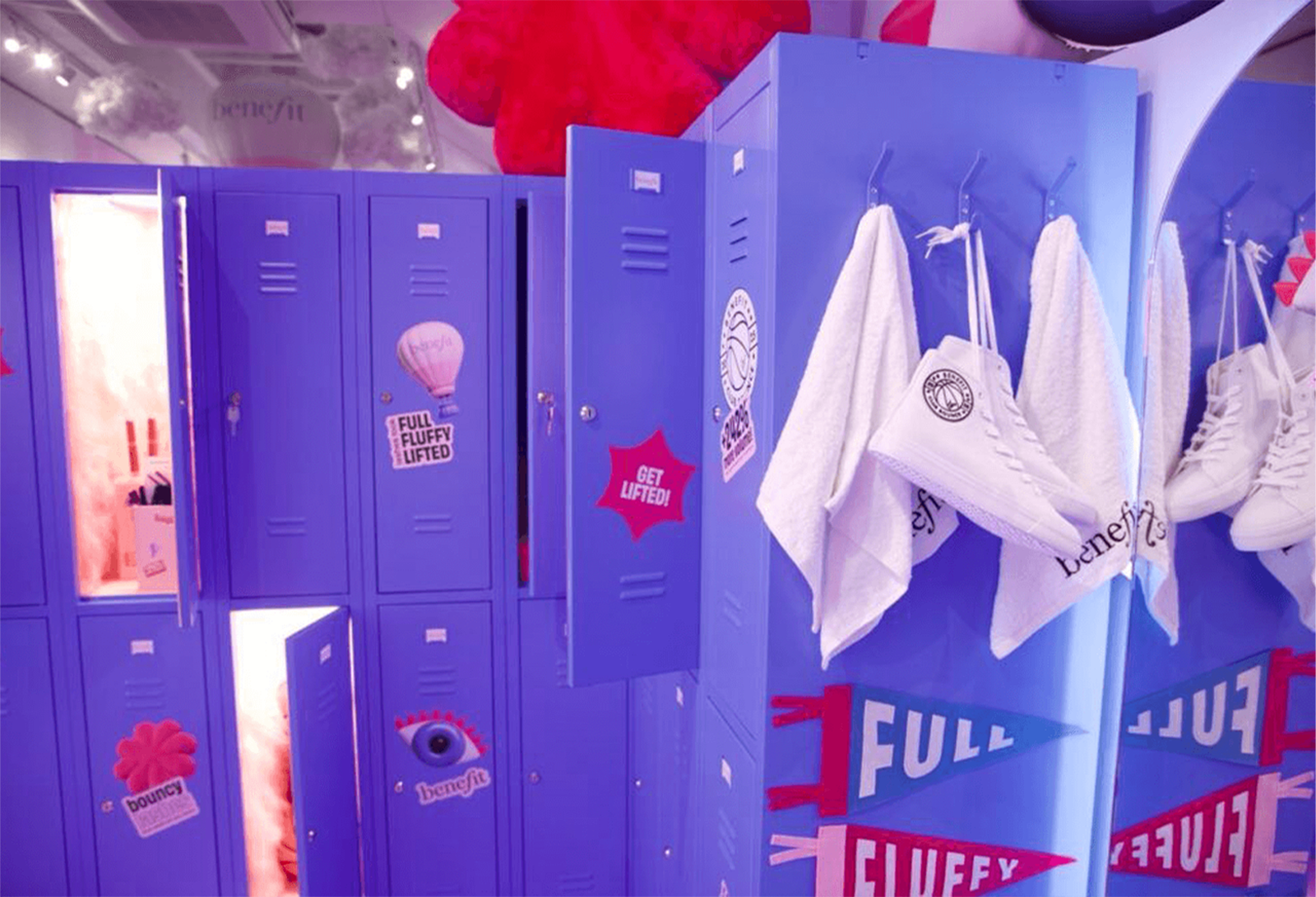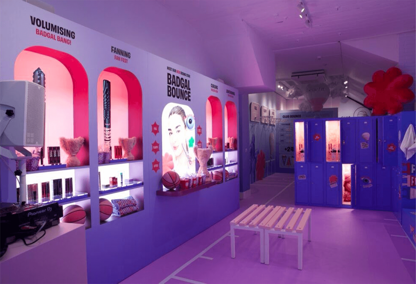 Benefit Cosmetics: Focusing on the brand’s recently launched BADgal Bounce Volumizing Mascara, Benefit Cosmetics hosted “Club Bounce” at Noho Showrooms, London. Combining sport and beauty in an interactive setting, the venue featured basketball-inspired elements such as a purple court with oversized branded basketballs, where visitors could test their shooting skills, and locker rooms decorated with product details. The pop-up engaged fans with a trampoline selfie zone for social media content creation, as well as a hall of fame highlighting Benefit's other mascara offerings, cementing its place in the prestige beauty market. Exclusive merchandise framed the walls, including basketball jerseys with words like “lifted” and “fluffy,” referencing lashes coated with the BADgal Bounce Volumizing mascara. In addition to Club Bounce, Benefit also hosted a hot-air-balloon-inspired pop-up at Westfield, London, Manchester’s Trafford Centre, and Bluewater, each of which similarly focused on the launch of BADgal Bounce.