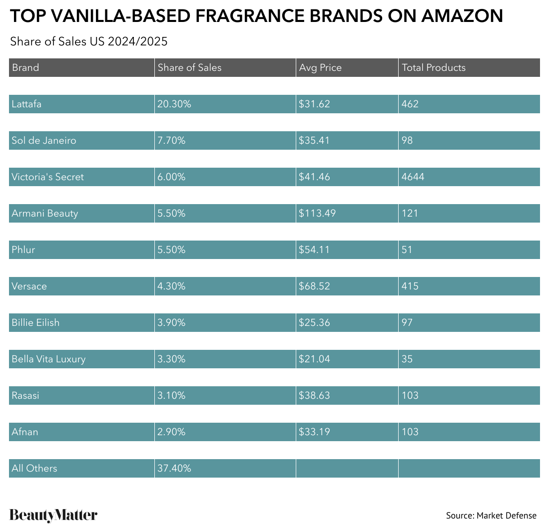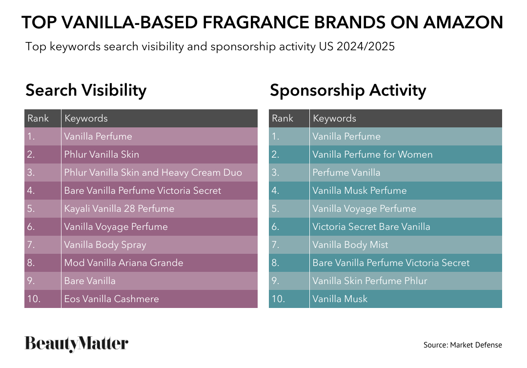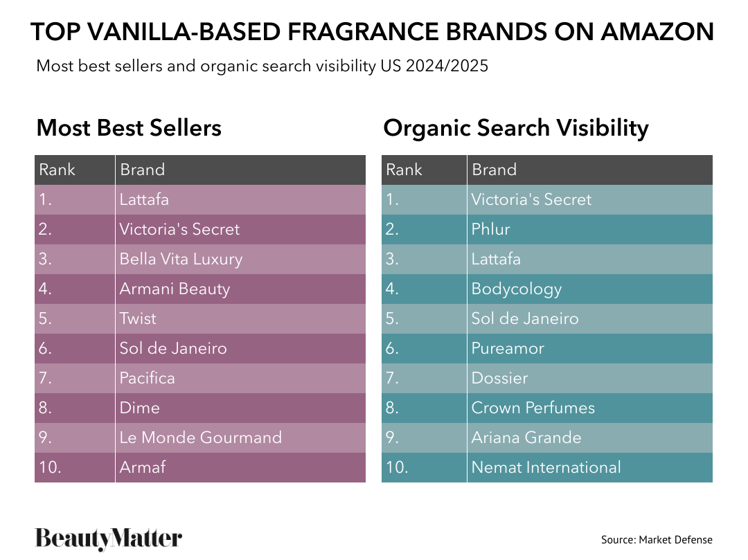 Market Defense, the full-service marketplace agency, unpacked the fragrance brands driving the vanilla trend on Amazon, tracking every product that ranks for “vanilla” searches, from vanilla perfume to vanilla body spray, and measuring their share of the market. “We zoomed in on every fragrance that wins on ‘vanilla’ searches and measured who’s capturing the most share,” said Kuykendall.